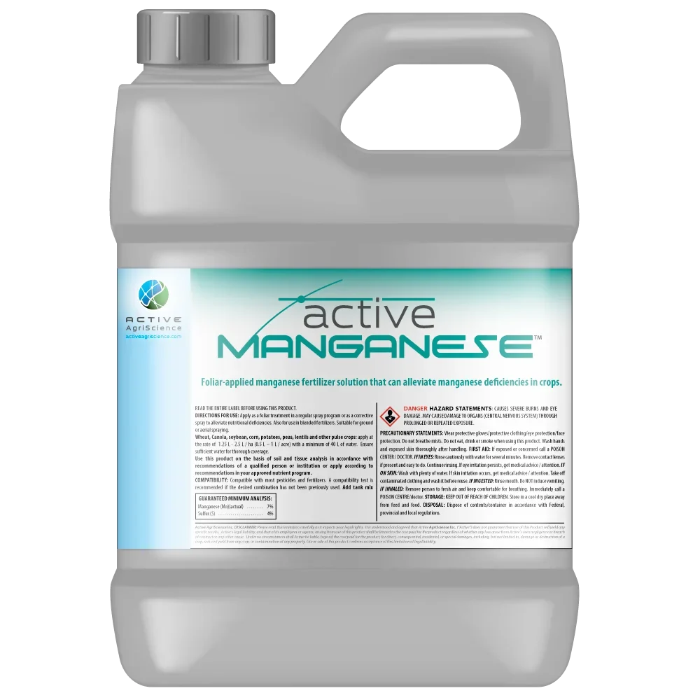 Active Manganese™ is a foliar-applied manganese fertiliser solution that alleviates manganese deficiency that can reduce crop yields. Powered by Active AgriScience’s proprietary bioactive complex Intrinsic, Active Manganese improves nutrient absorption and utilization efficiency while also enhancing stress mitigation.