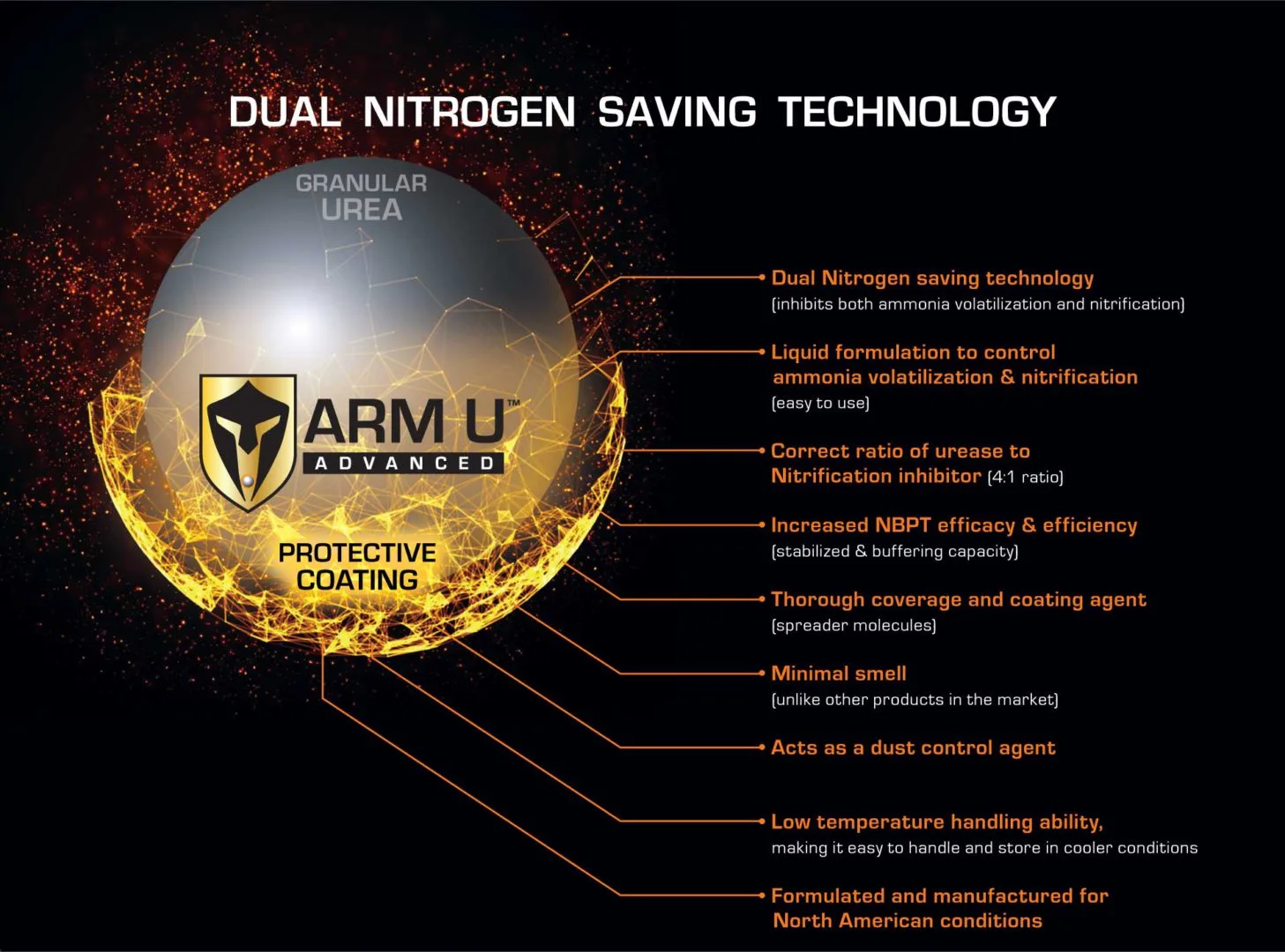 ARM U Advanced contains 3,4-DMPP (3,4-Dimethylpyrazole phosphate) which inhibits the Nitrosomonas and Nitrobacter bacteria that change ammonium into nitrate (nitrification). Without the conversion of ammonium to nitrate there can be no loss of nitrogen through leaching or denitrification.