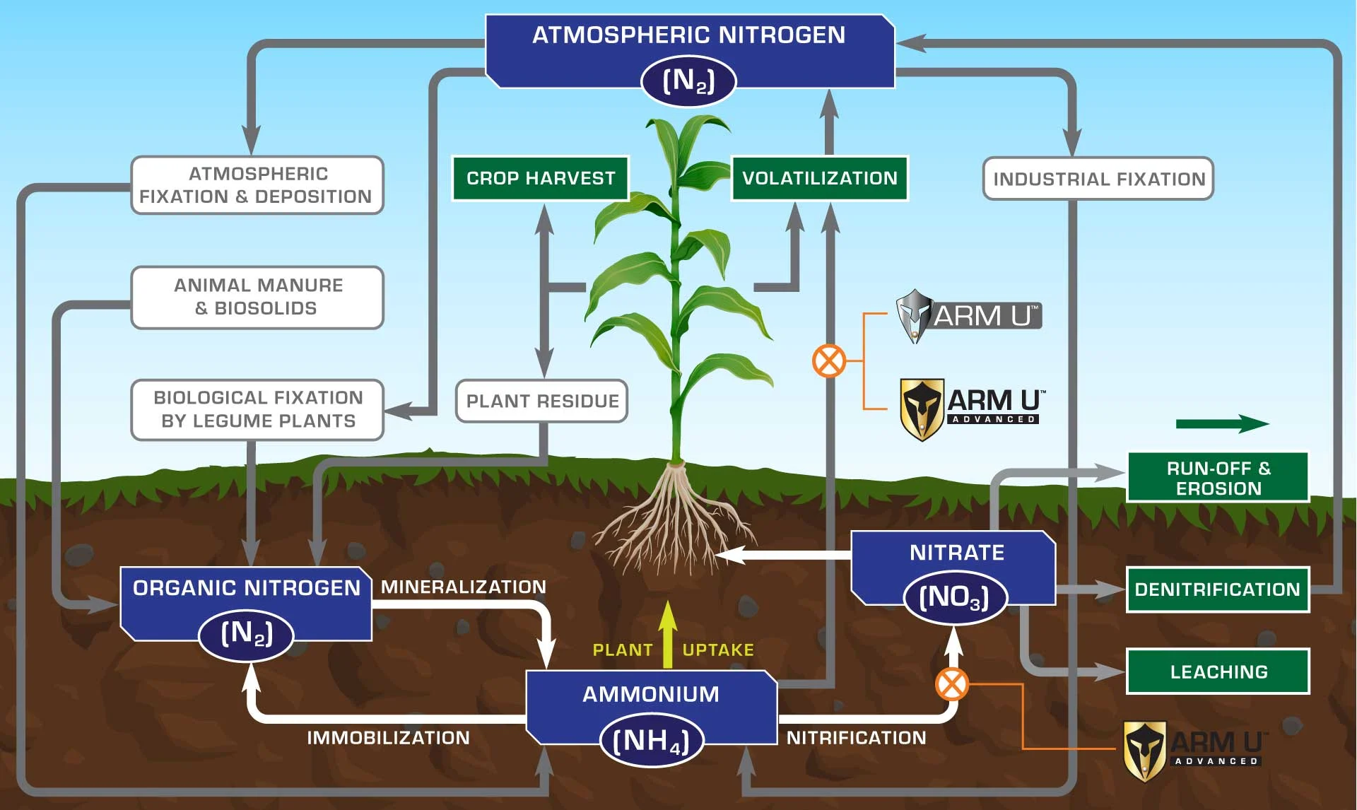 Both ARM U and ARM U Advanced contain NBPT (N-(n-butyl) thiophosphoric triamide). NBPT prevents ammonium volatilization by inhibiting the urease enzymes which break down ammonium fertilizer.