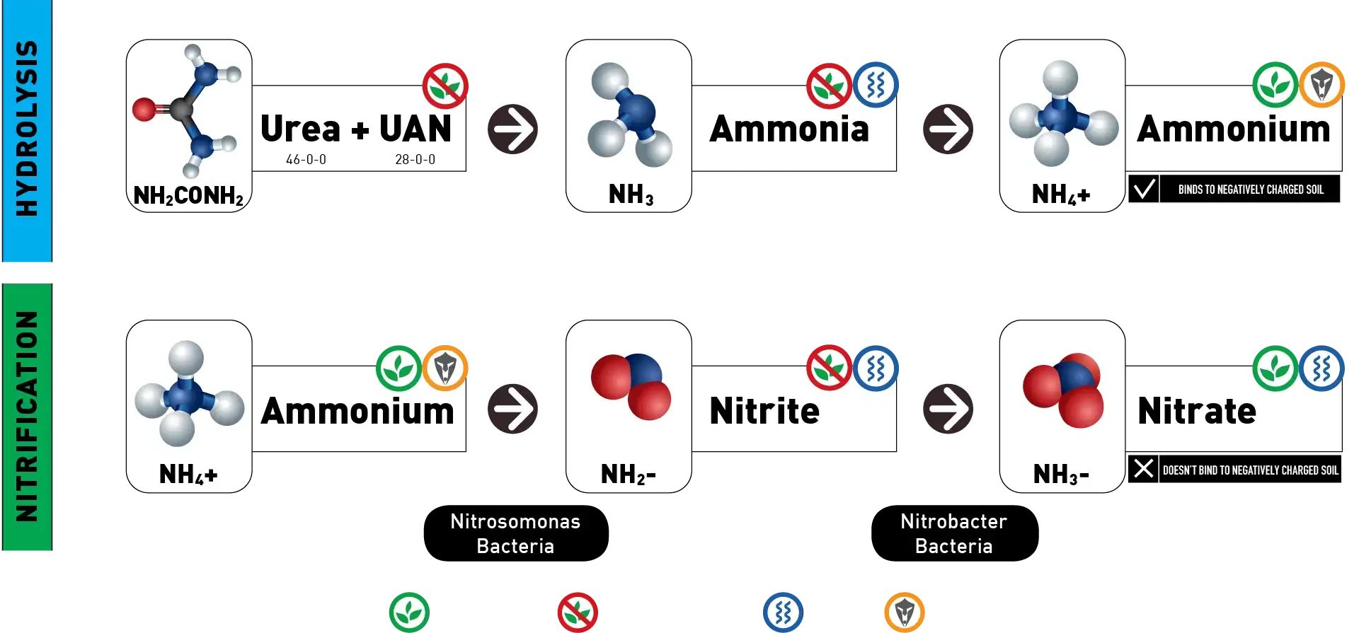 Nitrogen loss is caused by ammonia volatilization and nitrification processes. Ammonia volatilization occurs when urease enzymes convert urea-based fertilizers into ammonia gas, which can then escape into the atmosphere. Nitrification is the process by which soil bacteria convert ammonium to nitrate, an unstable form that is highly susceptible to loss through leaching, runoff, and denitrification.