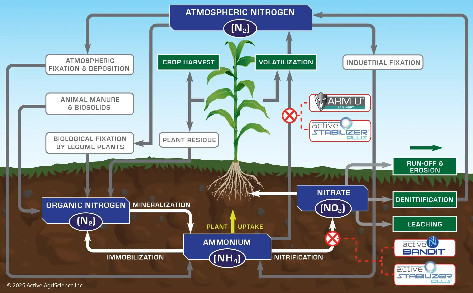 Active AgriScience nitrogen stabilizers inhibit either volatilization, nitrification, or both. ARM U 18% NBPT inhibits volatilization while Active BANDIT neutralize the bacteria that causes nitrification. Active STABILIZER PLUS is a dual nitrogen stabilizer that reduces both forms of nitrogen loss.