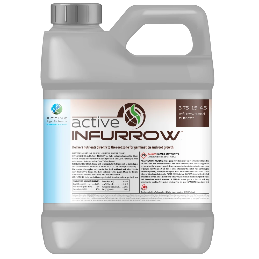 DIRECTIONS FOR USE: READ THE ENTIRE LABEL BEFORE USING THIS PRODUCT. SHAKE WELL BEFORE USING. Active INFURROW™ is a starter seed nutrient package that delivers essential nutrients and trace elements at planting for wheat, canola, corn, soybean, pea, lentils and other seeds. Apply once in a band 5 cm (2”) from the seeds. MIXING INSTRUCTIONS: