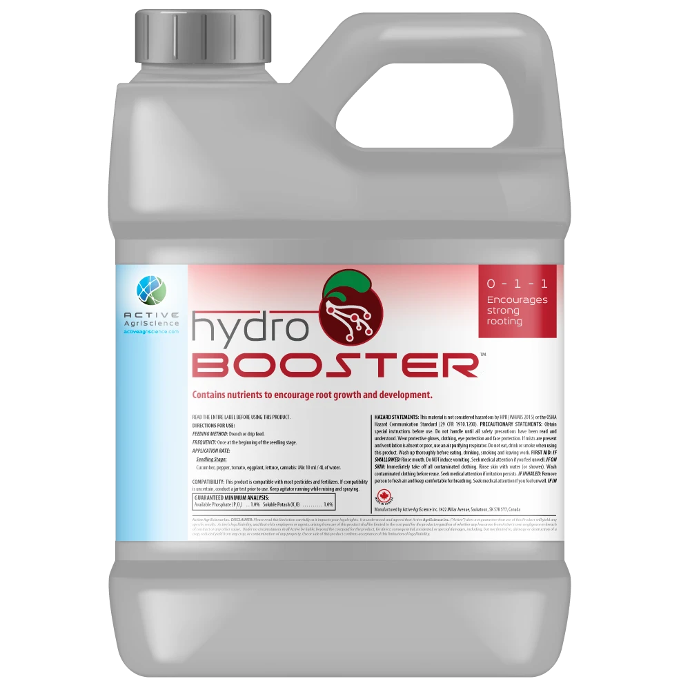 Hydro Booster™ is a mild solution of phosphate and potassium that fosters elongation of the primary root, and an increased number of laterals roots and root hairs, protecting the plant from shock by allowing nutrient uptake sooner.